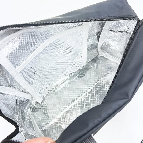 内側はアルミ仕様で、保冷保温できる優れもの。保冷剤を入れられるメッシュポケット付きです。口が広いので出し入れもしやすくなっています。