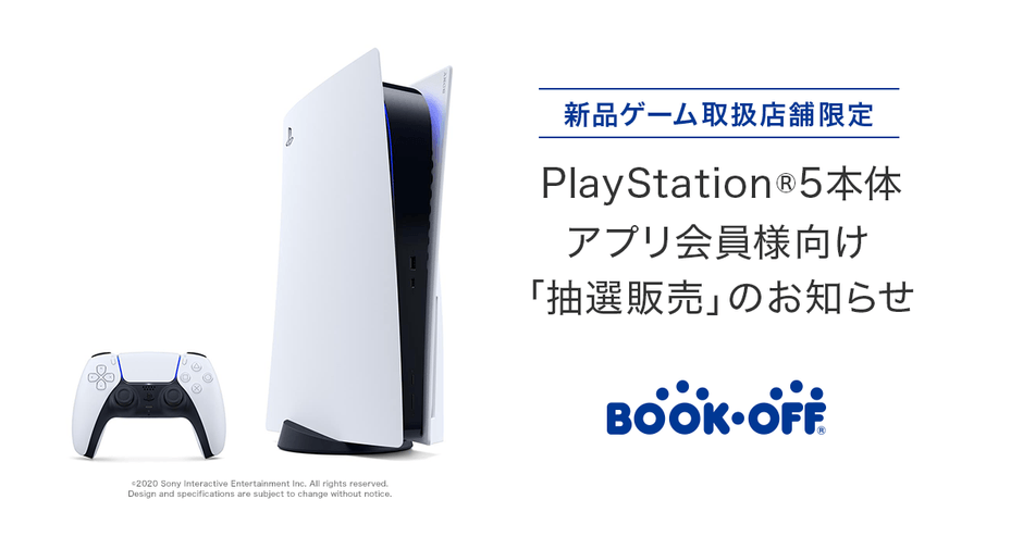 ブックオフグループホールディングス株式会社(本社:神奈川県相模原市、代表取締役社長:堀内 康隆)の子会社で、リユースショップ「BOOKOFF」を運営するブックオフコーポレーション株式会社(本社:神奈川県相模原市、代表取締役社長:堀内 康隆、以下 ブックオフ)は、BOOKOFF公式アプリ会員を対象に、『PlayStation(R)5』『PlayStation(R)5デジタル・エディション』の抽選販売の受付を2020年12月4日(金)17時00分~13日(日)17時59分まで行います。