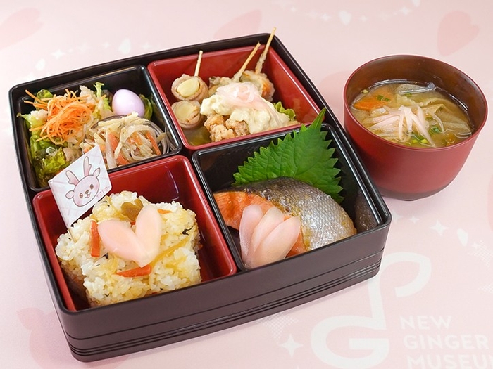 岩下の新生姜のおかず6種と混ぜごはんを盛り込み、イワシカちゃんデザインのランチ旗を添えました。