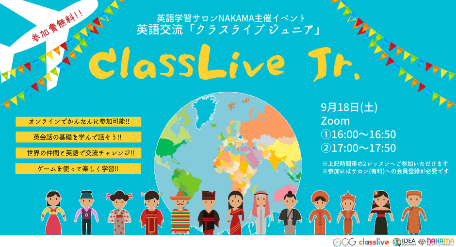 株式会社ジージー(所在地:大阪北区・東京渋谷区、代表取締役:平田 利行)は、セブ島で約10年にわたる語学学校「IDEA CEBU」の運営や日本の小中高生約1,200名以上の参加者を集めた名門ジュニアキャンプを実施してきたノウハウを基に、コロナ禍の今、“自宅から海外の同世代の仲間たちと出会える交流イベント”として「ClassLive Jr.(クラスライブ ジュニア)」を企画しました。開催日は9月18日(土)で、英語学習サロン「NAKAMA」へご入会いただくことで無料で参加できます。