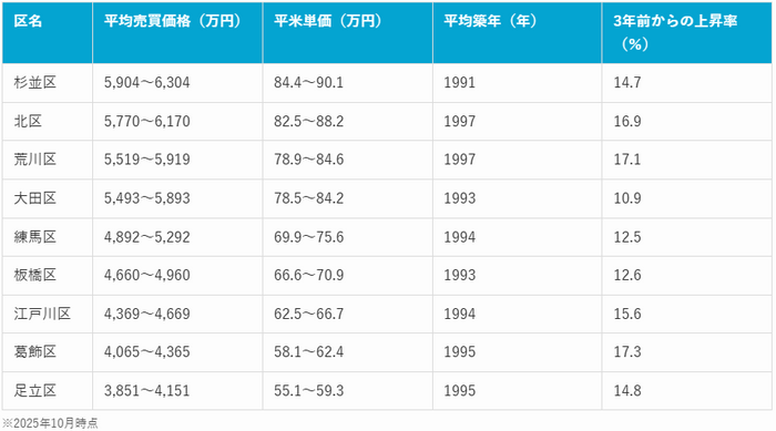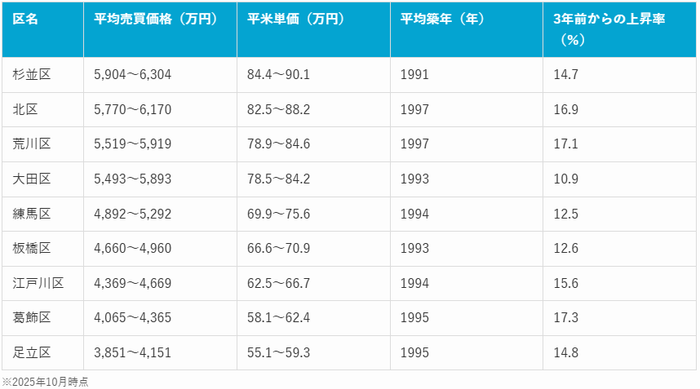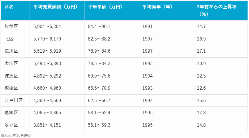平均築年数が20年〜30年以上にもかかわらず、3年前と比較して20%超〜65%と高い上昇率で価格が推移している点も需要と人気の高さを裏付けています。