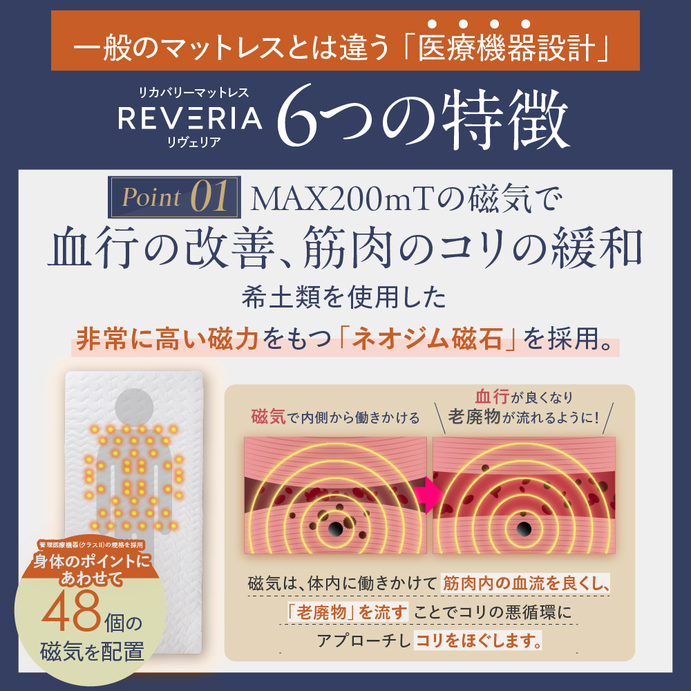 REVERIAは、こうした背景を踏まえ、1日の内の1/3を占めるといわれる睡眠中に磁気のチカラで首・肩・腰を集中的に血行促進・筋肉のコリを改善できるリカバリーマットレスとして開発されました。