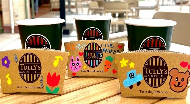 タリーズのエプロンをつけて記念写真もとれるよ!スリーブ・マグカップ用コーヒー1パック・おかしをプレゼント!