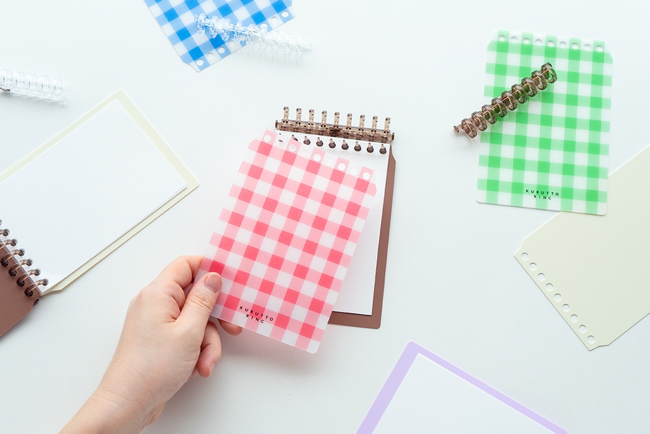表紙のラインアップは、シンプルな無地で人気色のアイボリー・パープル・ブラウンと、ファッションや雑貨で昨今のトレンドであるギンガムチェック柄のレッド・ブルー・グリーンの合計6柄。リングはクリアとブラウンの2色です。なお、あらかじめ組み合わせされたセット品での販売もございます。