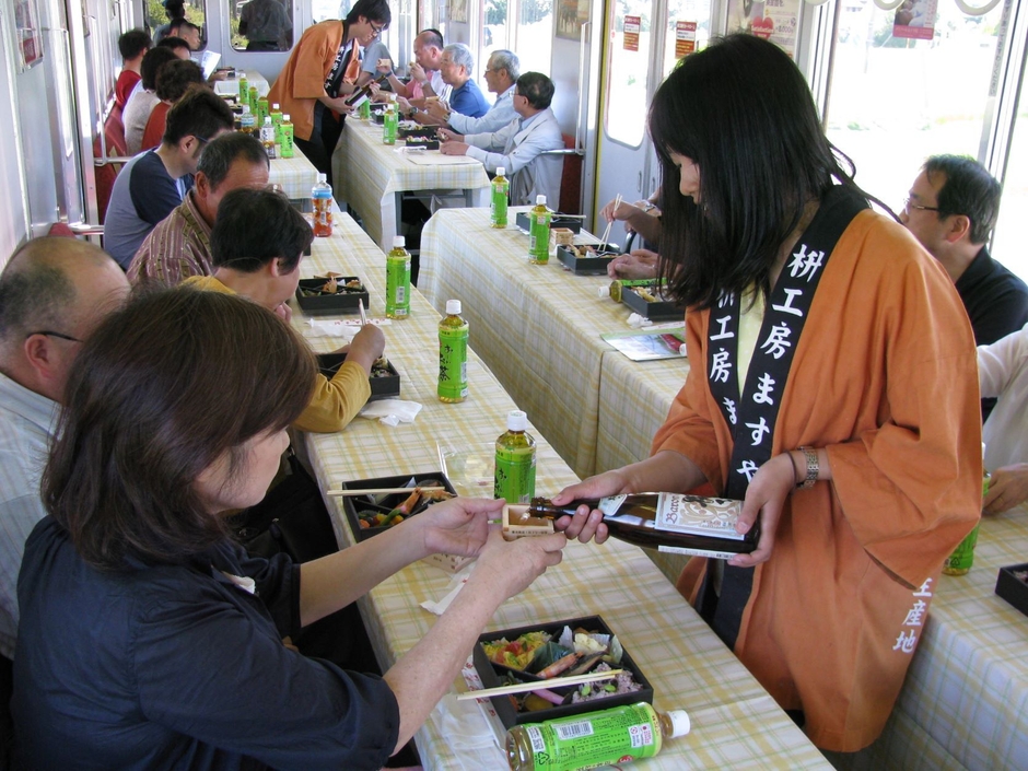 大垣市の木枡は、全国シェアの8割を誇る特産品であり、養老鉄道では木枡を利用した枡酒列車を実施しており、大変好評をいただいている企画列車です。