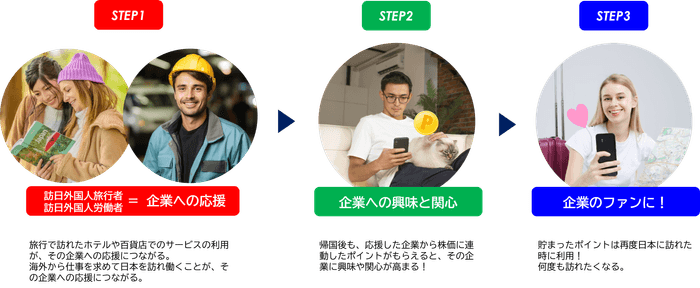 金融機関では難しい日本国内に居住のない訪日外国人旅行者や短期留学生、外国人労働者にも、サービスの利用や働きに応じてインセンティブとしてココカブを付与することが可能です。