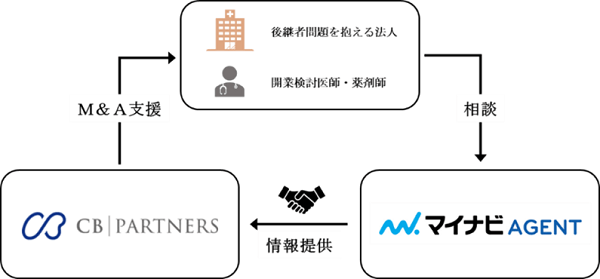 今回の提携先であるマイナビ社が運営する人材紹介事業『マイナビAGENT』は、一般企業のみならず、医療法人、調剤薬局をはじめとする医療・介護・福祉業界の人材紹介についても幅広い実績を有しており、現在も人材紹介サービスを提供する中で、顧客より事業承継や開業希望の相談を受けています。本業務提携を通じ、『マイナビAGENT』が長年人材ビジネスで培ってきた経験と、CBパートナーズが保有する業界特化のM&A情報を活用することで、両社の顧客に対し、より幅広い後継者候補の紹介や事業承継の提案をするとともに、事業承継支援による地域医療存続のための「後継者問題」の解決を図ってまいります。