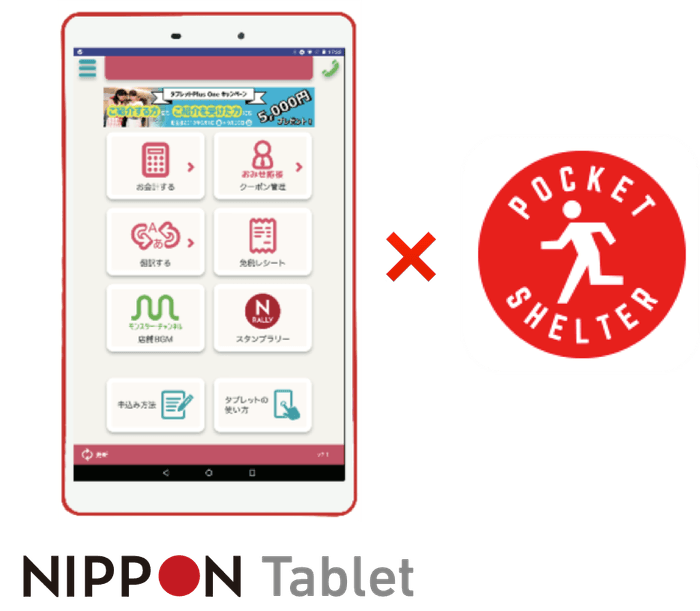 「防犯・防災・おもてなし」をキーワードに、店舗の防犯・防災に役立つ機能、そしてキャッシュレス決済や通訳などおもてなし機能を搭載した専用タブレット端末を店舗等に無料でレンタルする取り組みを行っているNIPPON Tablet株式会社(東京本社:東京都品川区、代表取締役社長:武田 知之、以下 ニッポンタブレット)は、このほど、同社の専用タブレット端末にポケットシェルター株式会社(本社:東京都港区、代表取締役:藤川 博久)の防災アプリ「ポケットシェルター」の搭載を決定、9月中に「ポケットシェルター」によるサービスの提供をスタートします。