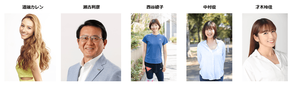 大会アンバサダーはモデルの道端カレンさん。2018年の本大会で41分という好タイムで完走した経験を持ち、2019年京都丹波トライアスロンin南丹では女子総合優勝をされるなど、モデルとしてだけでなく、数々のスポーツシーンでもご活躍されています。大会アドバイザーの瀬古利彦さんと共に大会を盛り上げます。また、西谷綾子さん、中村優さん、才木玲佳さんはゲストランナーとして参加者とともに10kmのコースを駆け抜けます。
