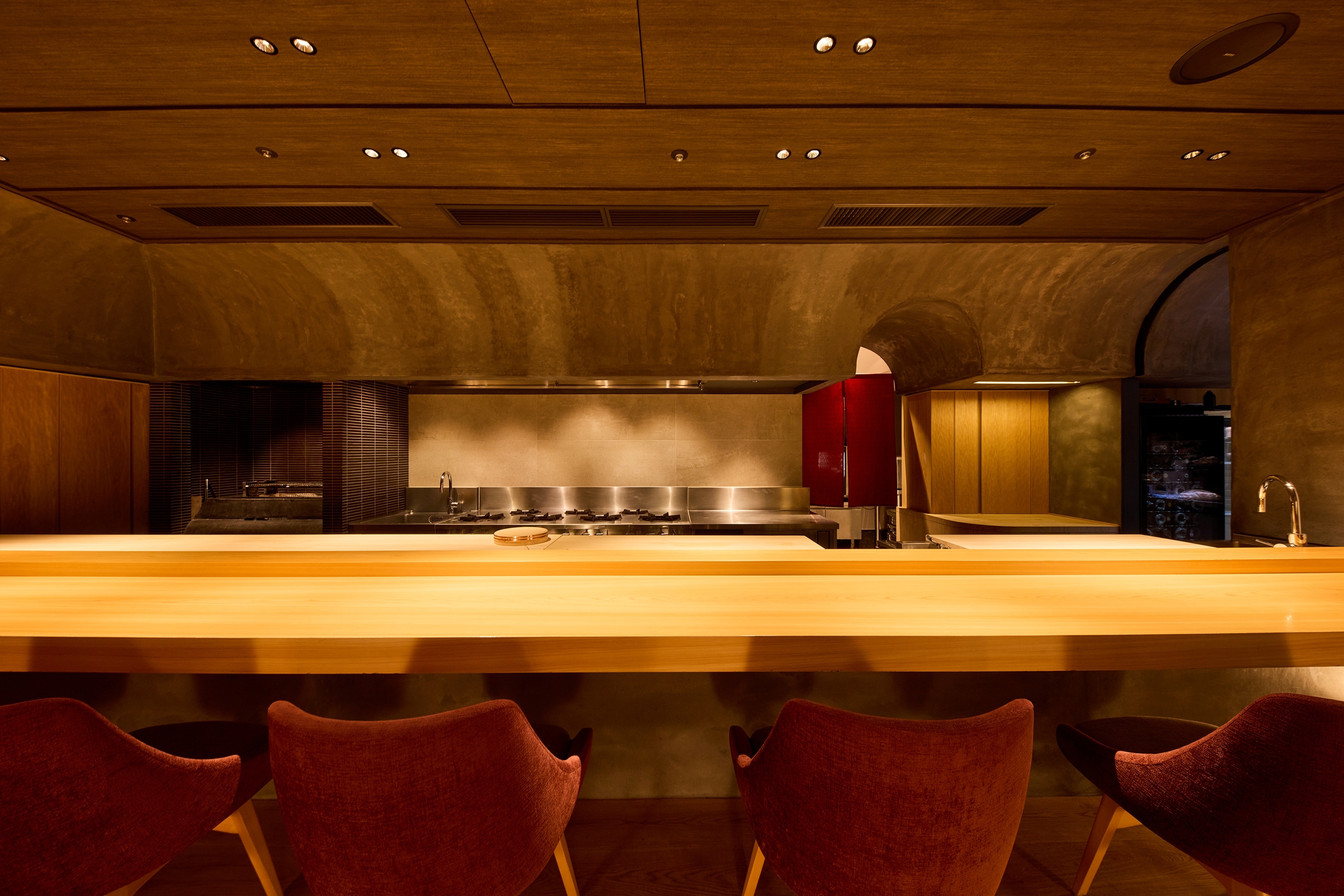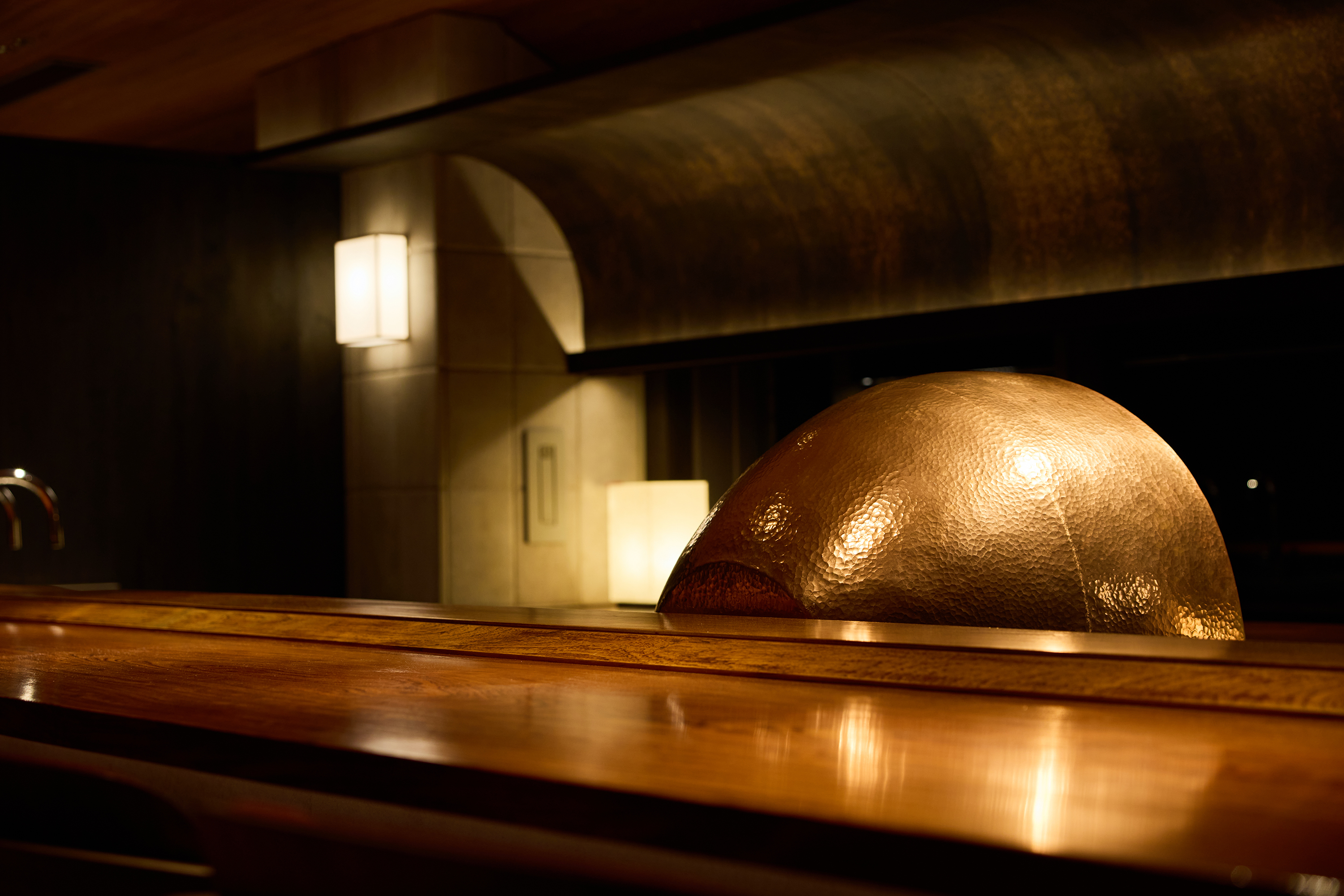 白木を基調にしたミニマルなカウンター席です。やわらかな陰影と計算された照明が、握りや料理の美しさを際立たせます。料理人の所作を追いながら、静の美学と臨場感を体感いただける空間です。