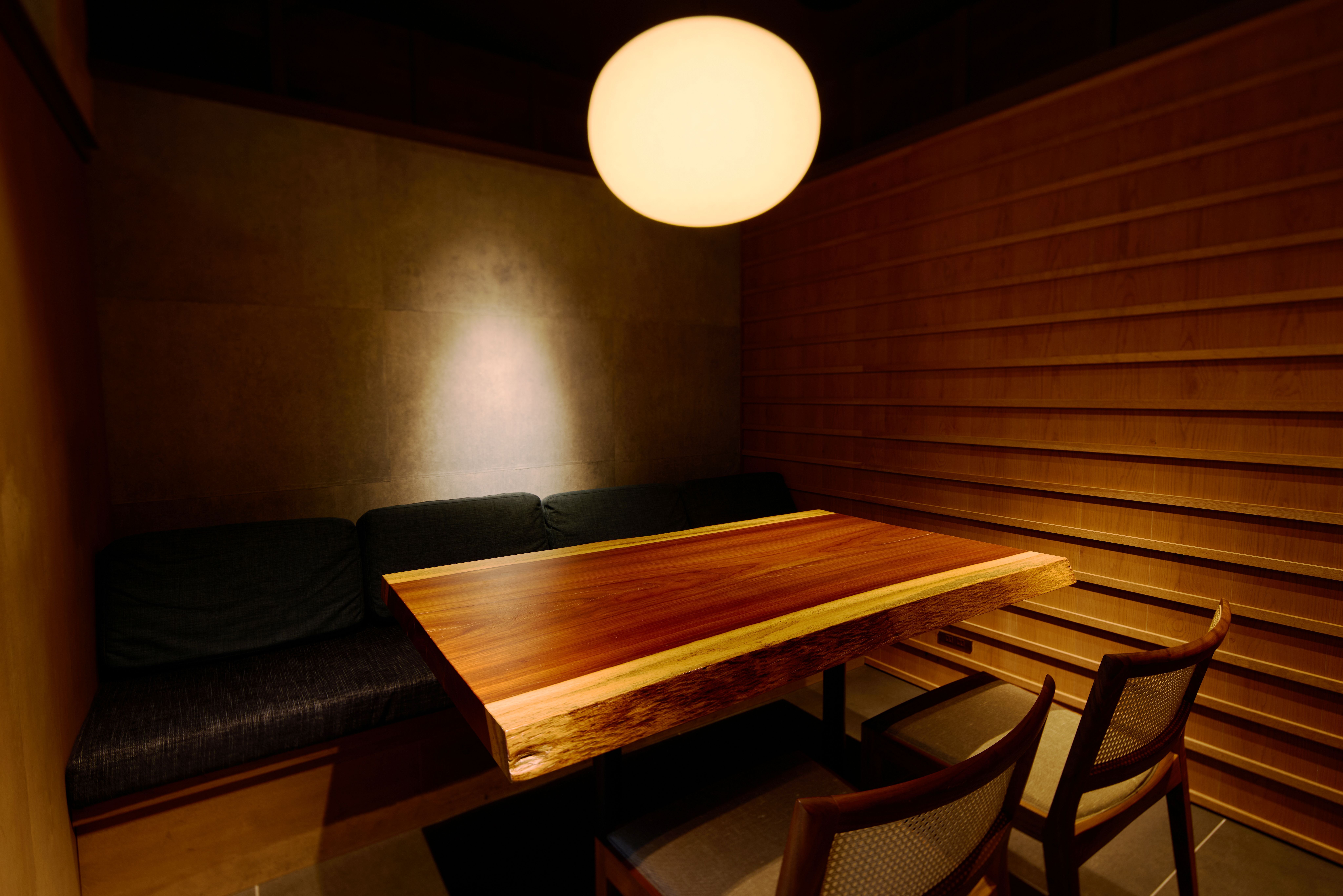 和モダンの落ち着いた設えで、肩肘張らずに料理を楽しめる空間です。ご家族でのご利用にも最適で、お隣のお席との適度な距離も保てるように配されています。