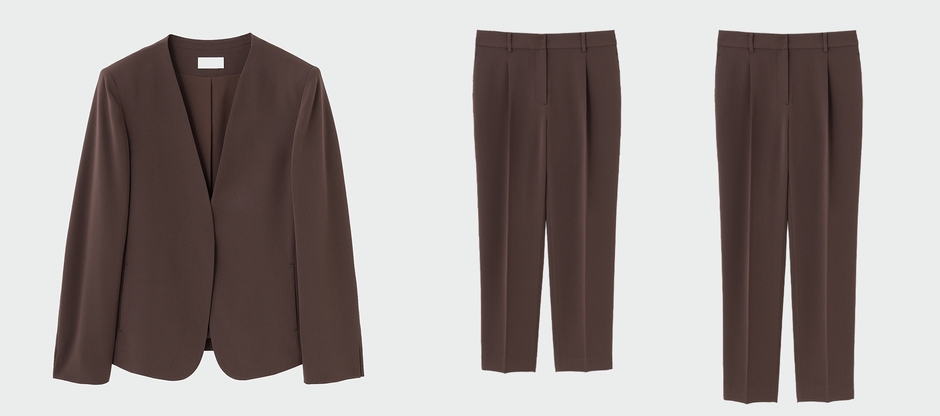 すっきりとしたシルエットがエレガントな印象を与えるジャケット、腰回りから脚のラインをキレイに見せるテーパードパンツを展開。テーパードパンツには通常のサイズから丈のみ長くした、「丈長め」も揃い、お好みのスタイルに合わせてお選びいただけます。