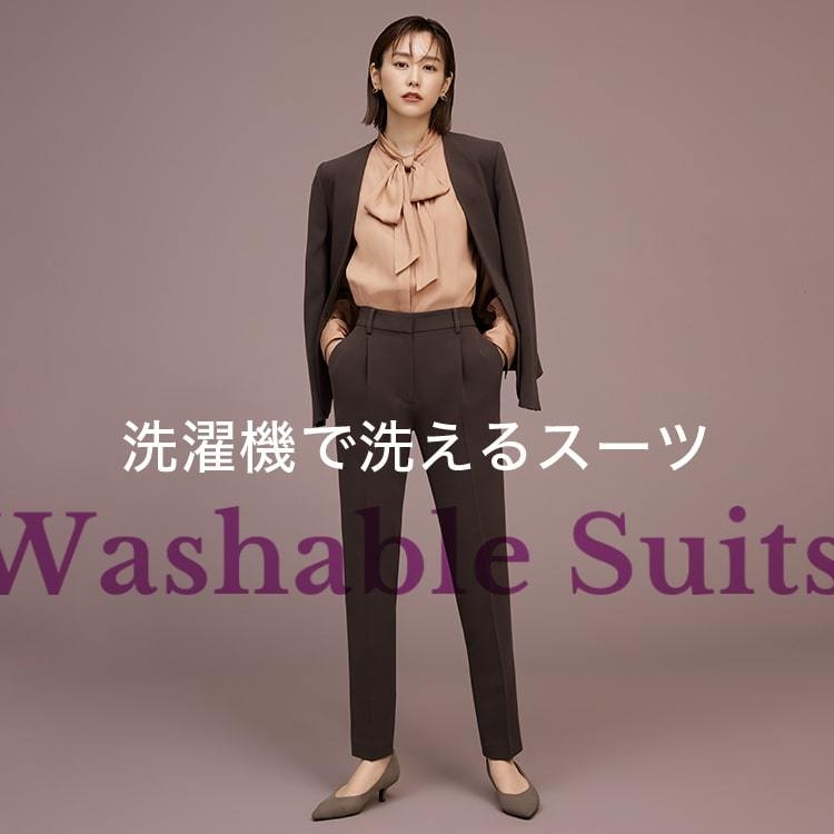 プラステの「洗濯機で洗えるスーツ」は、(1)たたむ (2)ネットに入れる (3)洗濯機をまわすの3ステップで、ご家庭で簡単にお洗濯が可能です。最適な方法でお手入れしていただくことで、より長くキレイにご着用いただけます。