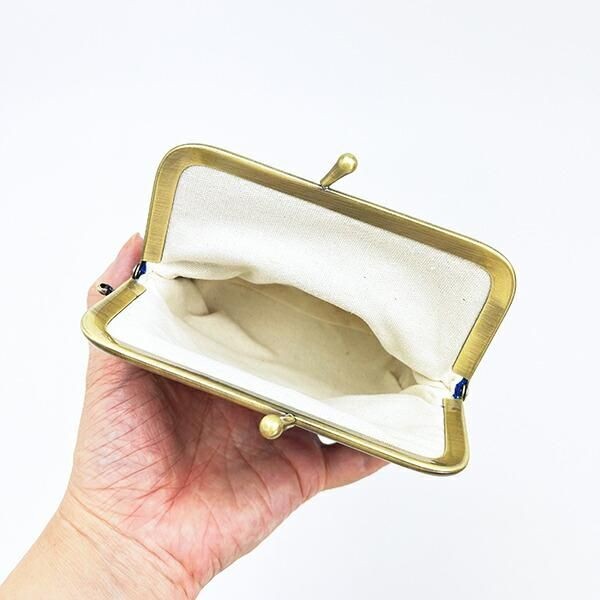 小さめのかわいいミニがま口タイプです。小さめなので、こまごました持ち物を収納するのにも活躍しそうです。ガマ口なので口がしっかり開くので中に入れたものを出し入れしやすそうです。サイズ:13cm×13.5cm×4.5cm 素材:綿、スチール