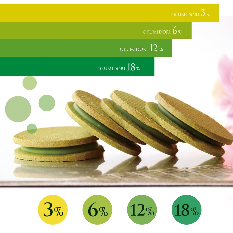 3%、6%、12%、18%の4種類の異なる濃度の抹茶チョコを、自家製のサクサク抹茶クッキー生地で贅沢にサンドしました。