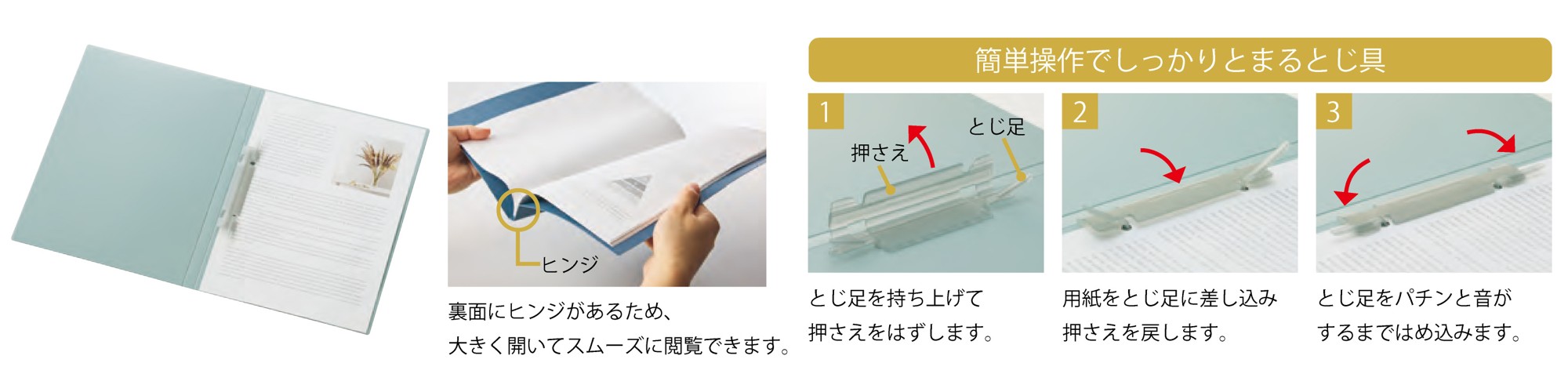 紙おさえと、とじ足が一体化した使いやすいデザイン