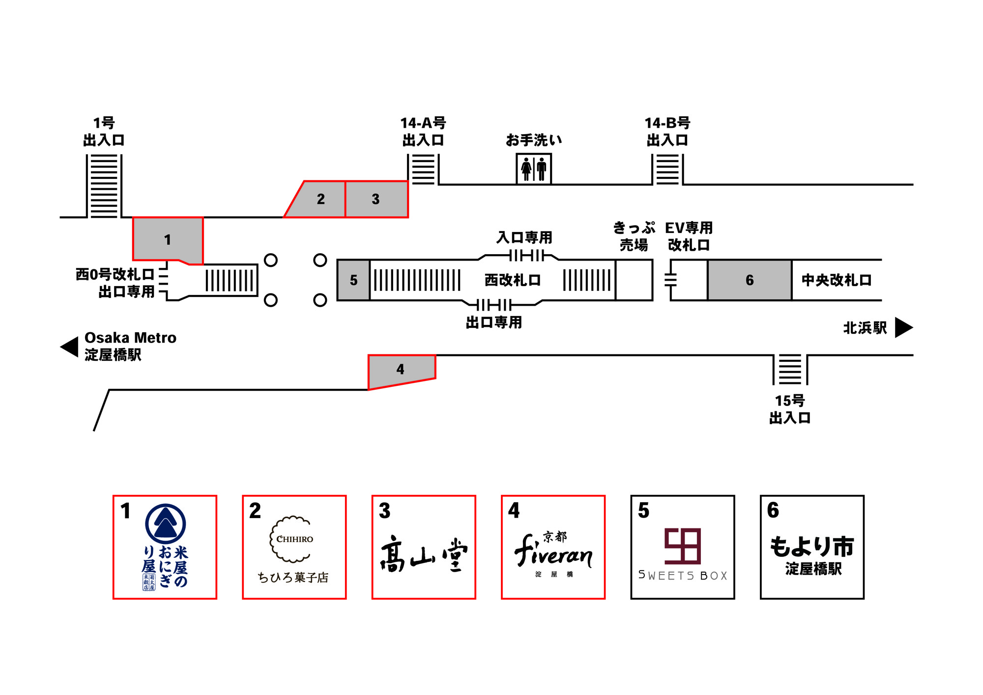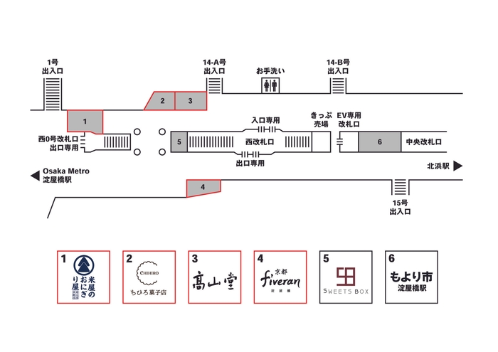 今回開業の3区画も全てテイクアウトの食物販業態で、「米屋のおにぎり屋 菊太屋米穀店(おにぎり・弁当等)」「ちひろ菓子店(焼菓子)」「髙山堂(和菓子)」というラインナップです。営業中の「もより市 淀屋橋駅」「SWEETS BOX 淀屋橋店」「京都 fiveran 淀屋橋(ベーカリー)」と合わせて、近隣オフィスワーカーの昼食時や帰宅時のご利用はもちろん、手土産需要の充足や、観光行楽の移動の合間に手軽に食事やおやつをお買い求めいただく等、お客さまのご利用シーンに合わせて、駅ナカでのお買い物の楽しさを提供いたします。
