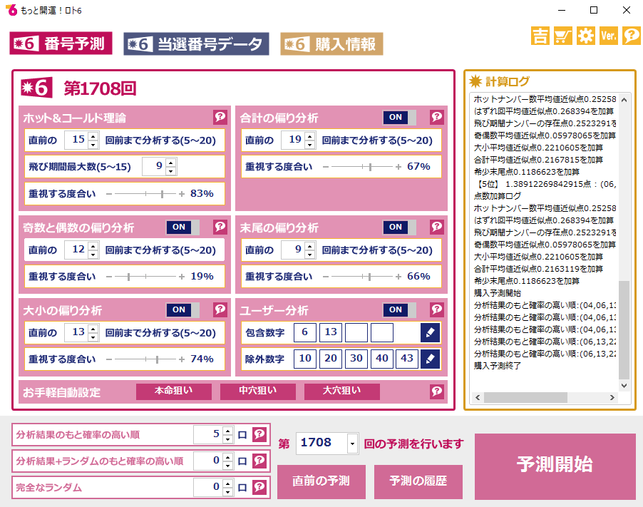 また、ソフト側に予測をすべて委ねることもできますが、「分析理論の組み合わせ」を自分で設定できるため、自分だけの「黄金比」を割り出して高額当選を目指すことができます。