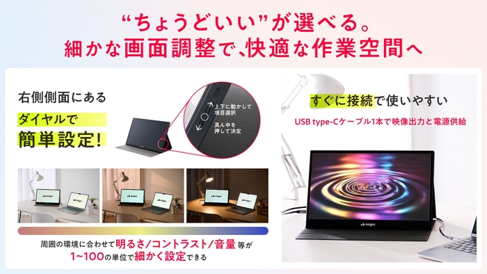 ダイヤル1つで細かな設定も簡単操作で調整可能。場所を選ばず自由に使える簡単接続で、ノートPCやスマホに繋ぐだけで手軽に使えます。薄型軽量だから省スペースに設置でき、持ち運びもラクラク。仕事も趣味も一歩上の快適さを叶えるパートナーです。