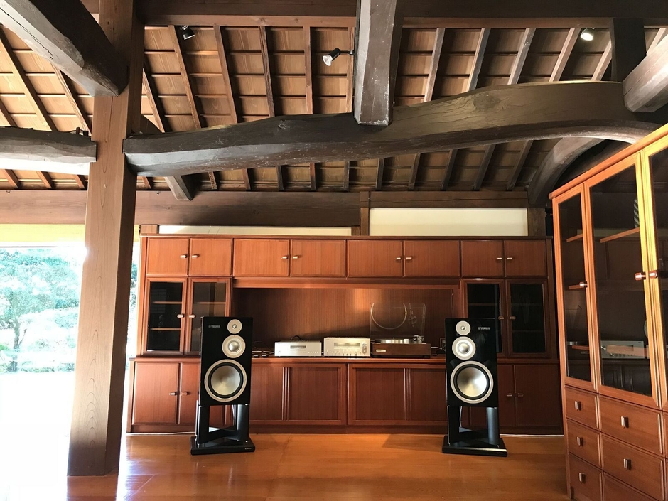 「葛城北の丸」の離れにある客室棟で、天井が高く極太の梁や柱、ムク板の床張りなど、格式高い庄屋の古民家をそのまま移築した「匠の技」が息づく、ぜいたくな空間です。現在は、ヤマハの最高級オーディオセットを設置し、ご宿泊者様限定の「オーディオ鑑賞ラウンジ」としても利用されています。