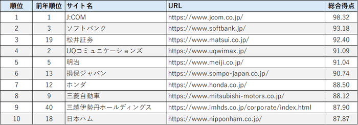 「情報通信」、「自動車・自動二輪」、「銀行・クレジットカード」、「証券・保険」、「商社・流通・小売」、「食品・飲料・生活用品」、「鉄道・運輸」の7業界、50サイト。