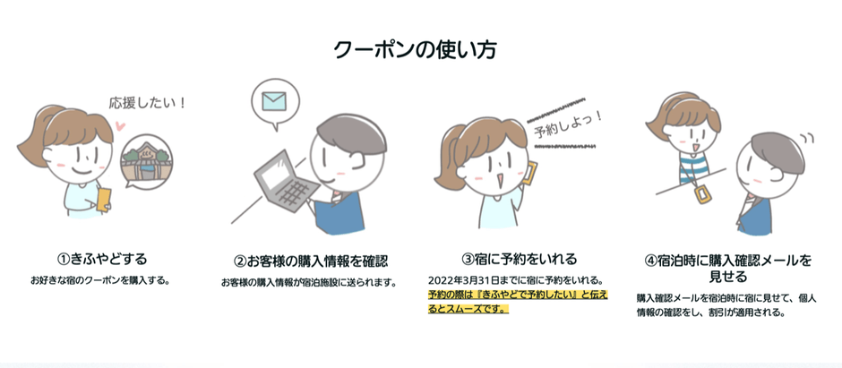 購入の仕方やクーポンの仕組みなどシンプルさを意識して開発され、手数料や掲載料などの宿泊施設側の負担は一切ありません。また、購入時に宿へのメッセージを入力することができ、応援する気持ちを伝えることができます。