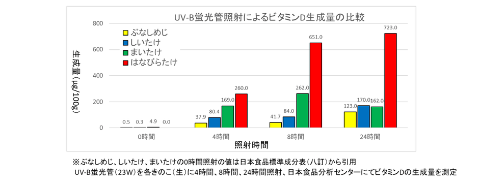ハナビラタケは生のままではビタミンDが検出されませんが、天日干しした乾燥ハナビラタケには日本国内の主な食品の中でも突出したビタミンD量(378マイクロg/100g、乾燥マイタケの約19倍以上)が含まれることに着目。ハナビラタケの菌床栽培のノウハウを生かし、紫外線を人工的に照射することで、ハナビラタケ100gあたり700マイクロgを超えるビタミンDを生成することに成功しました。現代社会では日本人の多くがビタミンD不足とされており、今回開発したハナビラタケによって、食品によるビタミンD摂取を後押ししたい考えです。
