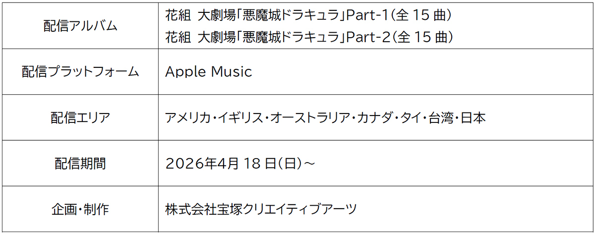 1986年のシリーズ第1作発売以来、日本のみならず世界中のファンから長きにわたって愛され続けている株式会社コナミデジタルエンタテインメントのゴシックホラーアクションゲーム「悪魔城ドラキュラ」。宝塚歌劇ならではのオリジナルストーリーと演出により、史上初のミュージカル作品として誕生した同作品をプラットフォーム「Beyond LIVE」を通じて2025年12月~2026年3月31日の期間限定で全世界動画配信を実施しましたが、このたびApple Musicにて国内配信と同時に、アメリカ・イギリス・オーストラリア・カナダ・タイ・台湾へ同作品の楽曲アルバム2種をお届けいたします。