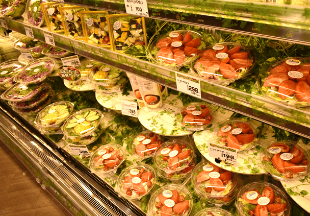 新鮮な野菜を使用し、店内で手作りした彩り豊かなサラダ。野菜コーナーで販売しています。