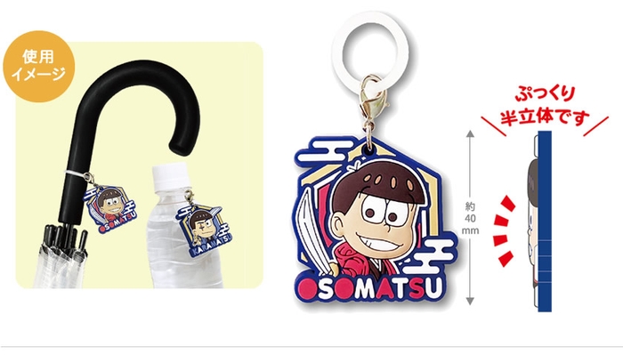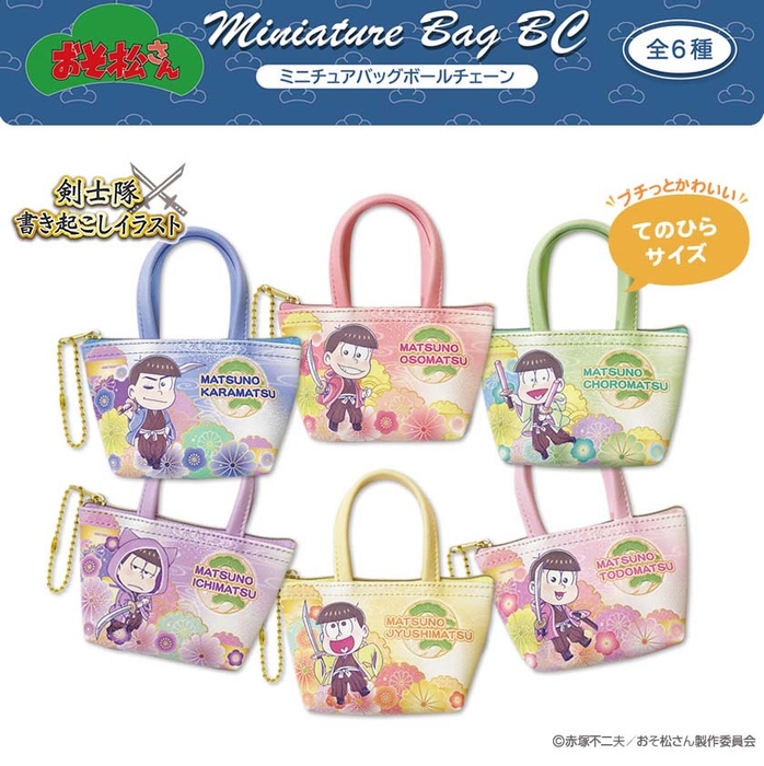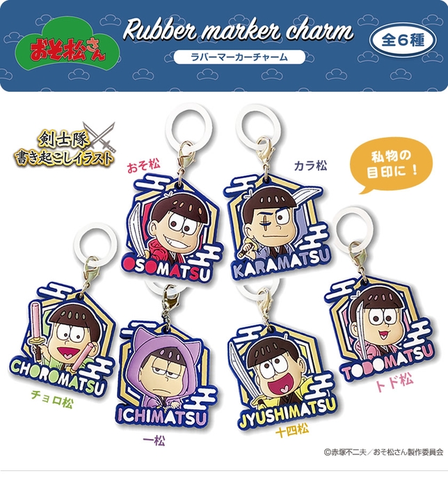 剣士隊書き起こしイラスト!! TV放映中の おそ松さんから、剣士隊書き起こしデザインのミニチュアバッグ、ラバーマカーチャーム 発売!