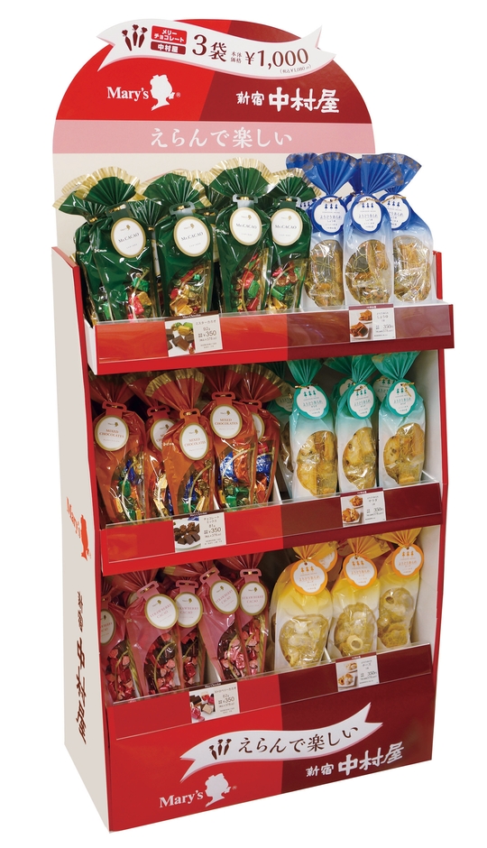 10月に創業70年をむかえる株式会社メリーチョコレートカムパニーと1901年創業の中村屋は、ここ最近の店頭での進物需要の伸び悩みやステイホーム推奨で、ご自宅で過ごす時間が長くなってきている傾向などから、量販店での自家需要の強化対策として「おうちスイーツ」を共同企画いたしました。通常は 2 社とも別々の棚で販売していますが、今回は中村屋の新商品「よりどり銘菓」とメリーチョコレートの自家需要人気商品「メリースイーツタイム」、両社の商品を並べるオリジナルの棚を共同で作り、お好みの商品を自由に組み合わせてお選びいただけるようにしました。しかも 1 袋 378 円(税込)のところ 3袋 1,080 円(税込)のお得な価格で販売いたします。会社の垣根をはずし 1 社では実現できなかったチョコレートとおせんべいやかりんとうなど和洋とりどりのお菓子、そして甘辛の味のバリエーションと自家需要の充実したラインナップをそろえて、お客様に選ぶ楽しさをご提案してより充実した「おうちスイーツ」を楽しんでいただけるような機会を創出いたします。また、互いの顧客を共同企画に誘致することで、新規の顧客取り込みも狙います。秋から量販店で展開し、店頭を盛り上げていきます。