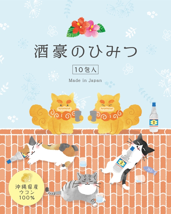 女性の「持っていても恥ずかしくないパッケージ」そんな声に応える沖縄赤瓦の上で、シーサーと猫たちが酒宴をする可愛らしいパッケージを採用し、持ち運びやすい個包装タイプ。外食先で手軽にお飲みいただけます。