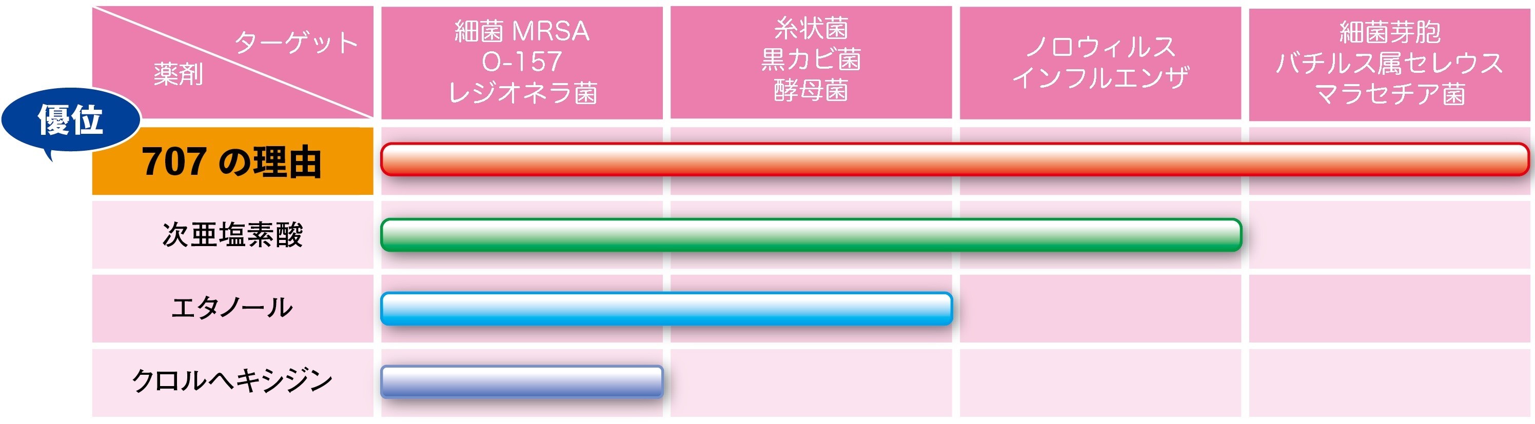 今までにない抗菌メカニズムにより、707種もの菌やウィルスに強力に作用します。