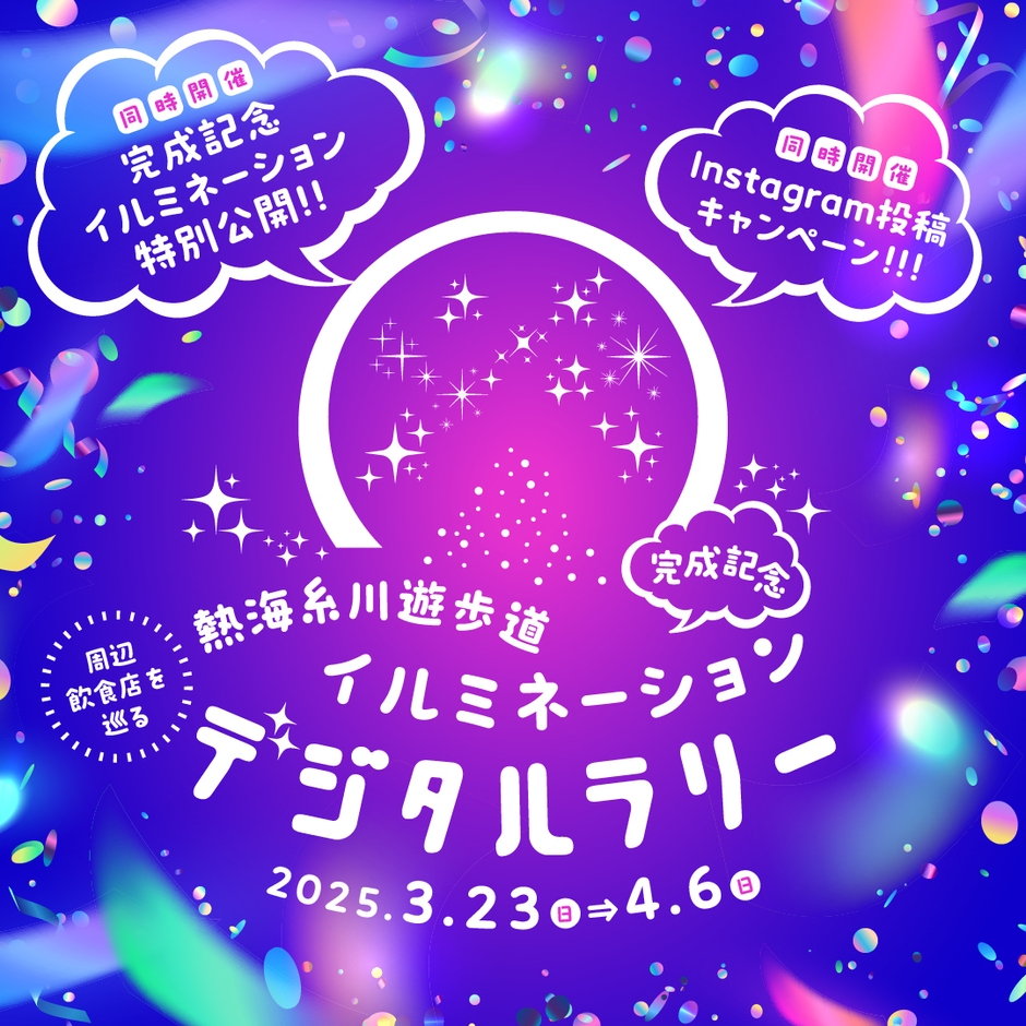 静岡県熱海市にある糸川遊歩道では2025年春、遊歩道周辺のナイトタイムを賑やかに演出するイルミネーションが完成いたしました。この完成を記念して2025年3月23日(日)より、周辺の飲食店を巡って熱海にまつわるアート作品がゲットできる周遊イベント「熱海糸川遊歩道イルミネーション完成記念 デジタルラリー」(主催:熱海市役所)を開催いたします。