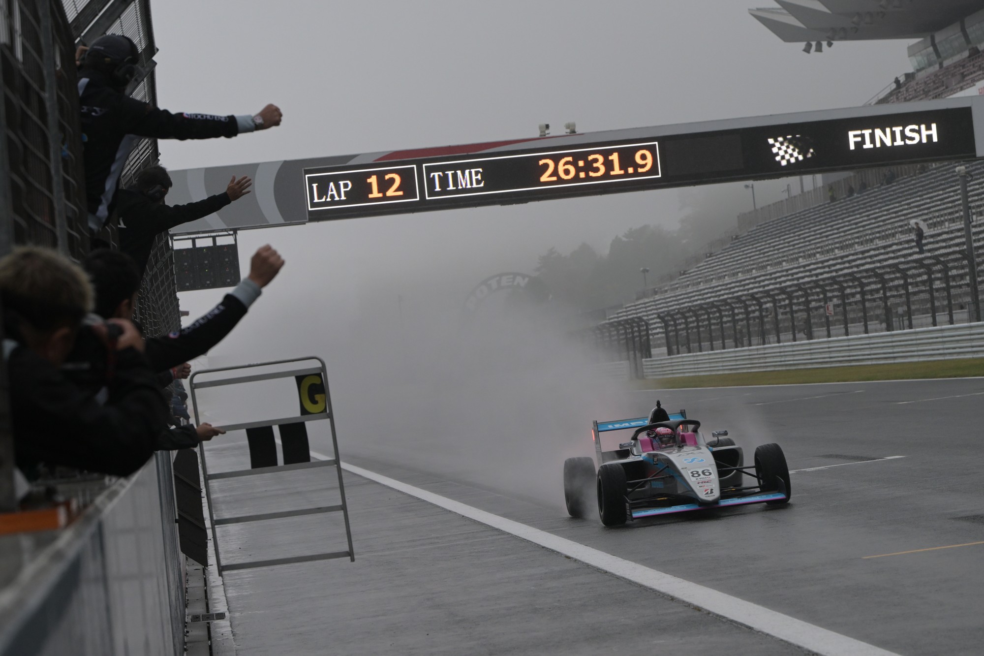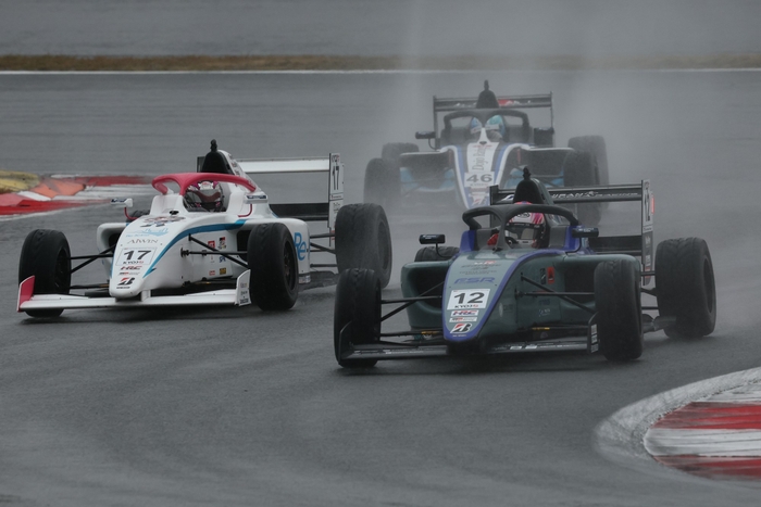 翌周のパナソニック オートモーティブコーナーでは、9番手の山本がコースオフを喫する痛恨のミス。入賞圏内を争っていた細川が9番手、白石が10番手に順位を上げた。一方、隊列先頭では下野が好ペースで周回を重ね、独走状態でレースは12周目に突入。最終的に約9.4秒のギャップを築いて今季8勝目を飾り、フォーミュラ初年度の最終レースをトップで締め括った。2位は翁長、3位は斎藤となり、9位でレースを終えた細川は今季初入賞を果たしている。