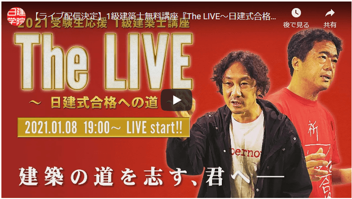 ▼LIVE配信決定!1級建築士無料講座「The LIVE ~日建式合格への道~」告知動画(YouTube)