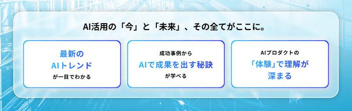 来場者は最新のAI技術やサービスを直接体験することができる他、AI技術の導入に関する疑問や課題を解決するための情報交換の場としても機能します。