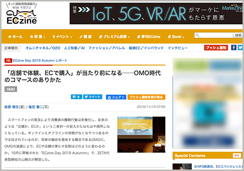 EC商品検索・レビュー・レコメンドを開発販売するコマースとCXのリーディングカンパニーであるZETA株式会社(本社:東京都世田谷区、以下ZETA)は、2019年10月3日(木)に開催されたEC向けマーケティングイベント『ECzine Day 2019 Autumn』にて「OMOを加速するレビューと店頭EC」と題しセミナーに登壇し、その様子がセミナーレポートとして公開されました。