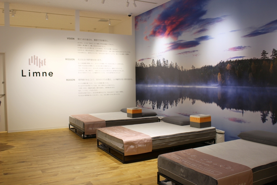 寝具の通信販売を行う株式会社LIMNEは、睡眠体験型ショールームを8月1日(火)恵比寿ガーデンプレイスにグランドオープンしました。ショールームでは、商品の持つやわらかな触感を最大限に感じていただけるよう、「4感(触覚・視覚・聴覚・嗅覚)で感じるリラックス」をテーマに設計しています。仕事やショッピングで疲れた方がゆっくりできるチル寝(休憩/くつろぎ)スペースとして自由に利用できます。