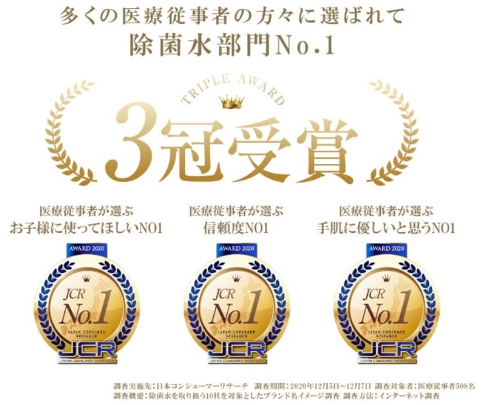 2020年11月より本格的に販売を開始しました、ノンアルコールで、ミネラルイオンの力で洗浄や除菌ができて、化粧水の原料にもなり飲めるほど安全な除菌水「HELP(ヘルプ)」が、508名の医療従事者の方々を対象に、(1)お子様に使ってほしい除菌水、(2)信頼度が高い除菌水、(3)手肌に優しいと思う除菌水の3つの部門で、アンケート調査を実施して高い評価を頂き、全ての部門で第1位に選出されました。
