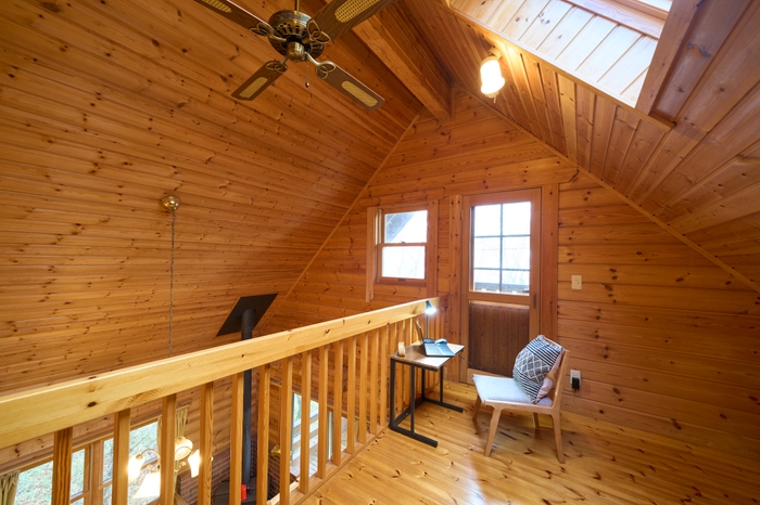 2階吹抜のロフトスペースは、ログハウスらしい木のぬくもりを活かした空間。
