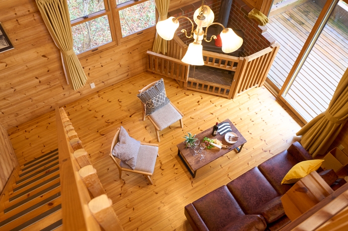 木の香りに包まれながら心穏やかに過ごせるくつろぎ空間のリビングには趣のある薪ストーブが設置され、冬季にはぬくもりとして活躍します。また、部屋からつながるウッドデッキでは、優雅で贅沢なプライベート空間が味わえ、大自然の中で落ち着いた別荘ライフがお楽しみいただけます。