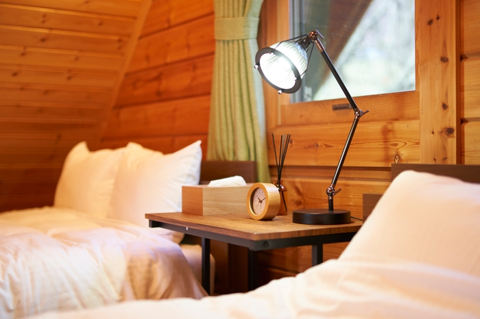 客室にはシングルベッド2 台、ダブルベッドを2 台と布団を2 組ご用意しています。