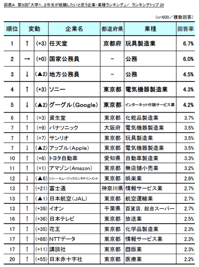 「大学1、2年生が就職したいと思う企業・業種ランキング」の1位は「任天堂」(回答率6.7%)となりました。次いで「国家公務員」が2位(同6.0%)、「地方公務員」が3位(同4.5%)となり、以下4位「ソニー」(同4.3%)、5位「グーグル(Google)」(同4.2%)、6位「資生堂」(同3.7%)、7位「パナソニック」(同3.5%)と続きました。