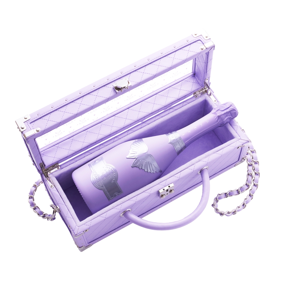 肩掛けもできるベルトが付いたバニティタイプの特製BOX入りで、レザータイプの他、手触りの良い高級感のあるファータイプの2種類で展開。自分へのご褒美にはもちろん、恋人や友人、ご家族など大切な方へのギフトとしても最適なシャンパーニュです。