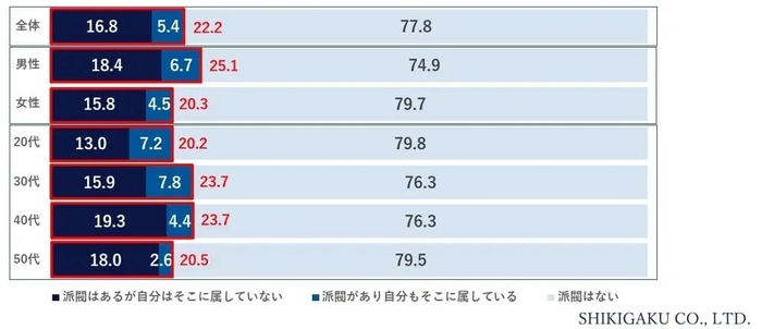 男女別でみると、存在すると回答した男性は25.1%に対し女性は20.3%と、やや男性の方が多いという結果でした。また、年代別で見ると、どの年代も大きな差はなく、若い世代にも年配の世代にも少なからず“派閥”は存在しているようでした。