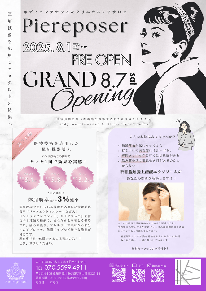 愛知県豊川市に、国家資格をもつ看護師が美容と健康をサポートするボディメンテナンス&クリニカルケアサロン「ピエルポゼ」が2025年8月7日にオープンします。
