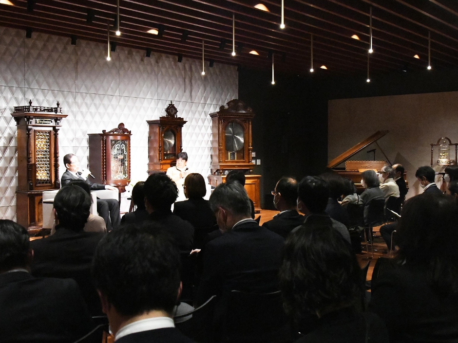 音楽史上・美術史上希少価値の高いアンティークオルゴール、オートマタ(からくり人形)、自動演奏ピアノなど347点を所蔵する体験型ミュージアム「永守コレクションギャラリー」(所在地:京都府向日市森本町東ノ口1番地1 ニデックパーク 運営:公益財団法人 永守文化記念財団 代表理事:永守 重信 以下、当館)は、開館一周年を記念し3月27日(水)に指揮者の佐渡 裕氏と当館代表理事の永守 重信による「次世代に語り継ぎたい音楽」をテーマにしたトークショーを行いました。