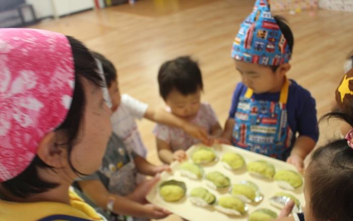 各クラスとも厨房に持っていき、「おいしく焼いてね」とお願いしました。できあがったスイートポテトを3時のおやつに食べた園児たちは、「あまーい」「おいしすぎる!」と、ペロッとたいらげていました。