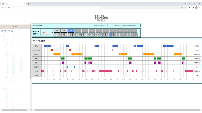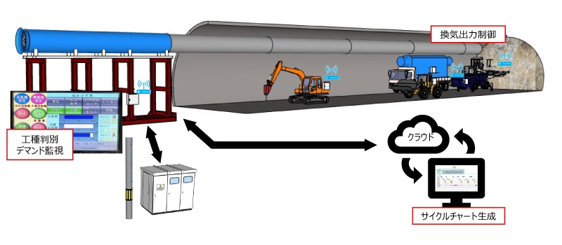 Hi-Resは「トンネル掘削の実績サイクルチャート自動生成」「作業工種に応じた最適な換気制御」「デマンド監視と使用電力量制御」等の機能を備えます。電気信号を得ることができる機械設備であればHi-Resと接続できるため、エンジン駆動の重機なども対象とすることができ、掘削方法やズリ運搬方法の制約を受けません。